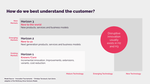 The Three Horizons of Innovation is a concept created by McKinsey, and whilst there is debate around the time element of their model, the descriptions are helpful in understanding where your business sits across types of innovation.