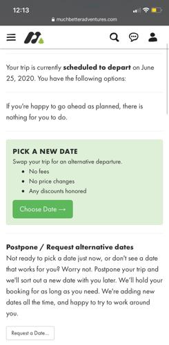 Of course, not every business can afford to give all customers refunds and survive to the end of the week. This doesn’t have to mean the end. Here’s an example of how to manage the situation from Much Better Adventures, a company that organises small group adventure holidays with local guides around the world.